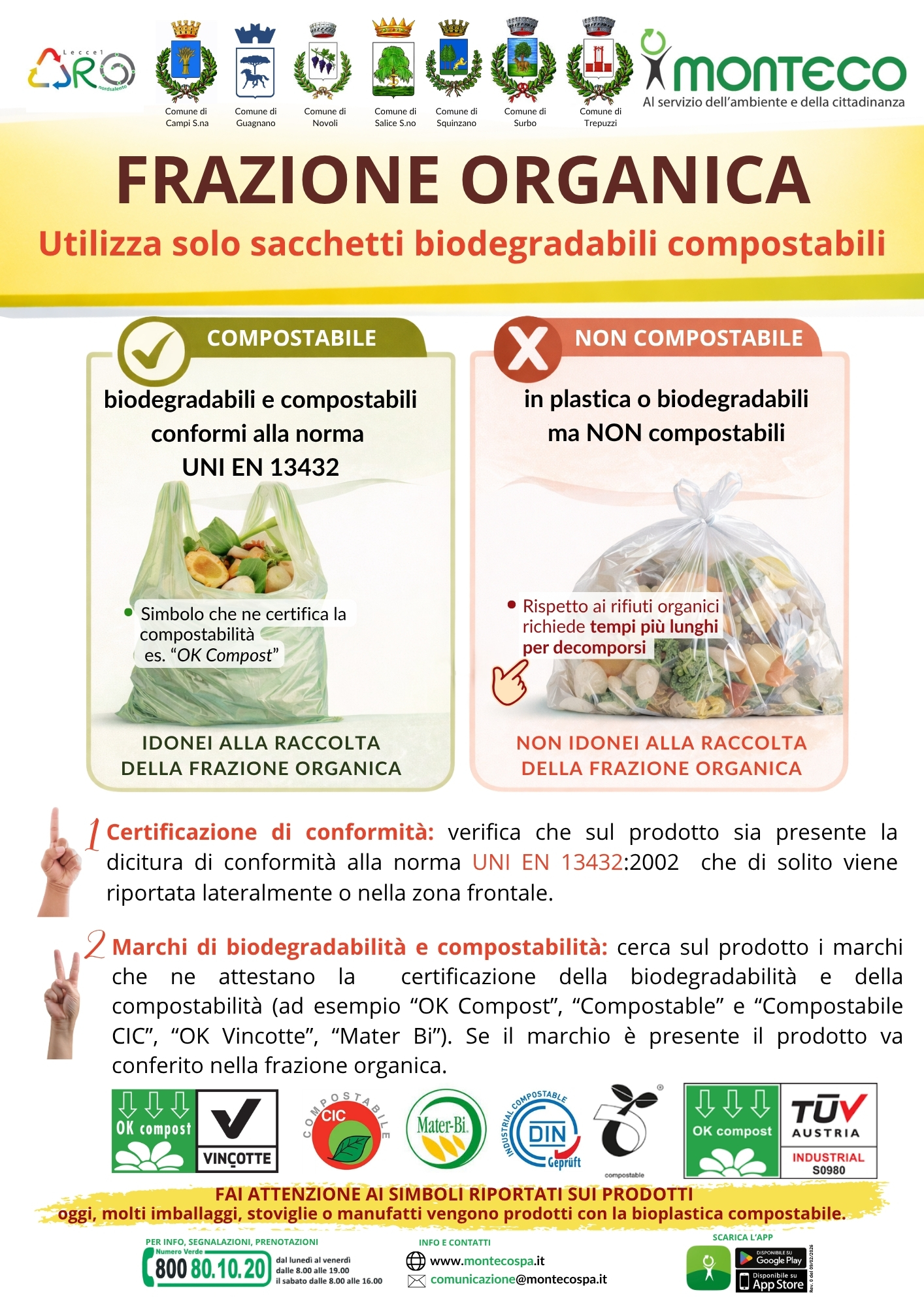 Per una raccolta differenziata corretta è importante usare solo sacchetti compostabili e verificare sempre simboli, sigle e diciture