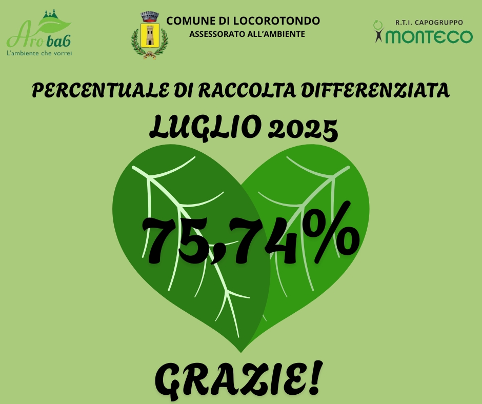 Anche il Comune di Locorotondo si conferma, ancora una volta, attento e sostenibile, raggiungendo il 𝟕𝟓,𝟕𝟓% di raccolta differenziata nel mese di luglio 2025, nonostante i numerosi eventi che continuano ad animare il territorio.