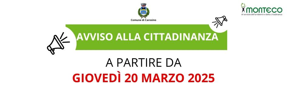 A partire da giovedì 20 marzo 2025, la raccolta a domicilio dei rifiuti INGOMBRANTI sarà effettuata il GIOVEDÌ anziché il VENERDÌ. Per prenotare il ritiro chiamare il numero verde 800 80 10 20.